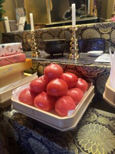 市場から持ってきたトマトをお供え。宝珠の形をしていてとても喜ばれました。