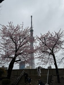 そこから隅田川方向へ行くとスカイツリーが桜の間から天に突き抜けていました。